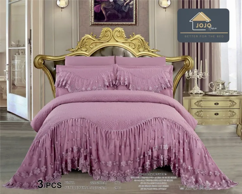 JOJO HOME Cuvertura Lux Matlasata cu Volan,Lila Pat 2 Persoane, 3 Piese, Finet-CVJ18