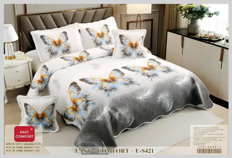 Cuvertura matlasata din bumbac 5 piese, alba cu fluturi albastri aurii-ES421 sunt utilizate pentru decorarea dormitorului dumneavoastra si in acelasi timp de a proteja lenjeria pentru pat de impuritati. Confectionate din bumbac 80% si satin 20%, cuverturile pentru pat sunt decorate cu imprimeuri sofisticate realizate cu masinarii de ultima generatie pentru a oferi o rezistenta sporita in timp. Cuverturile sunt ideale pentru toate anotimpurile. Materialele folosite sunt de calitate buna, produsul putând fi folosit un timp foarte îndelungat. Gama de modele este larga incepand de la modele clasice pana la cele mai moderne designuri, în diferite culori, clare si luminoase.Cuverturile de pat contureaza perfect un decor remarcabil in orice dormitor.Pachetul contine: