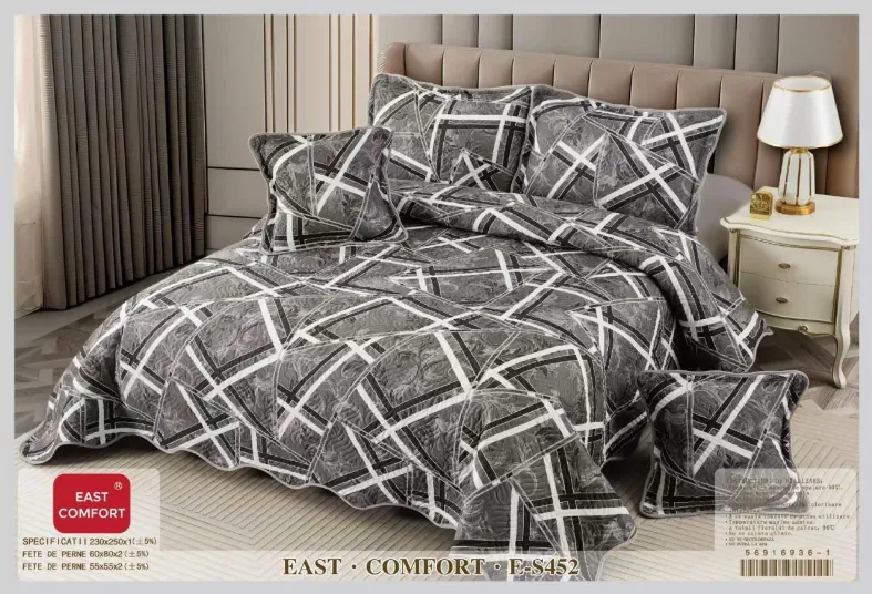 Cuvertura matlasata din bumbac 5 piese, gri cu linii albe abstracte-ES452 sunt utilizate pentru decorarea dormitorului dumneavoastra si in acelasi timp de a proteja lenjeria pentru pat de impuritati. Confectionate din bumbac 80% si satin 20%, cuverturile pentru pat sunt decorate cu imprimeuri sofisticate realizate cu masinarii de ultima generatie pentru a oferi o rezistenta sporita in timp. Cuverturile sunt ideale pentru toate anotimpurile. Materialele folosite sunt de calitate buna, produsul putând fi folosit un timp foarte îndelungat. Gama de modele este larga incepand de la modele clasice pana la cele mai moderne designuri, în diferite culori, clare si luminoase.Cuverturile de pat contureaza perfect un decor remarcabil in orice dormitor.Pachetul contine: