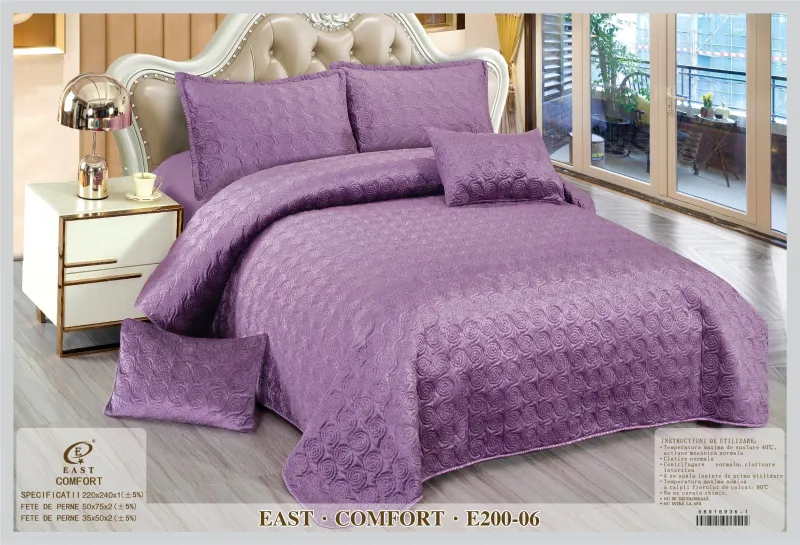 Cuverturile pat Catifea sunt utilizate pentru decorarea dormitorului dumneavoastra si in acelasi timp de a proteja lenjeria pentru pat de impuritati. Confectionate din bumbac 80% si satin 20%, cuverturile pentru pat sunt decorate cu imprimeuri sofisticate realizate cu masinarii de ultima generatie pentru a oferi o rezistenta sporita in timp. Cuverturile sunt ideale pentru toate anotimpurile. Materialele folosite sunt de calitate buna, produsul putând fi folosit un timp foarte îndelungat. Gama de modele este larga incepand de la modele clasice pana la cele mai moderne designuri, în diferite culori, clare si luminoase.Cuverturile de pat contureaza perfect un decor remarcabil in orice dormitor.Pachetul contine: