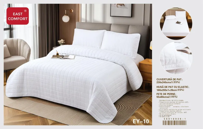 Cuverturile pentru pat sunt utilizate pentru decorarea dormitorului dumneavoastra si in acelasi timp de a proteja lenjeria pentru pat de impuritati. Confectionate din bumbac 80% si satin 20%, cuverturile pentru pat sunt decorate cu imprimeuri sofisticate realizate cu masinarii de ultima generatie pentru a oferi o rezistenta sporita in timp. Cuverturile sunt ideale pentru toate anotimpurile. Materialele folosite sunt de calitate buna, produsul putând fi folosit un timp foarte îndelungat. Gama de modele este larga incepand de la modele clasice pana la cele mai moderne designuri, în diferite culori, clare si luminoase.Cuverturile de pat contureaza perfect un decor remarcabil in orice dormitor.Pachetul contine: