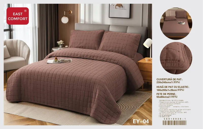 Cuverturile pentru pat sunt utilizate pentru decorarea dormitorului dumneavoastra si in acelasi timp de a proteja lenjeria pentru pat de impuritati. Confectionate din bumbac 80% si satin 20%, cuverturile pentru pat sunt decorate cu imprimeuri sofisticate realizate cu masinarii de ultima generatie pentru a oferi o rezistenta sporita in timp. Cuverturile sunt ideale pentru toate anotimpurile. Materialele folosite sunt de calitate buna, produsul putând fi folosit un timp foarte îndelungat. Gama de modele este larga incepand de la modele clasice pana la cele mai moderne designuri, în diferite culori, clare si luminoase.Cuverturile de pat contureaza perfect un decor remarcabil in orice dormitor.Pachetul contine: