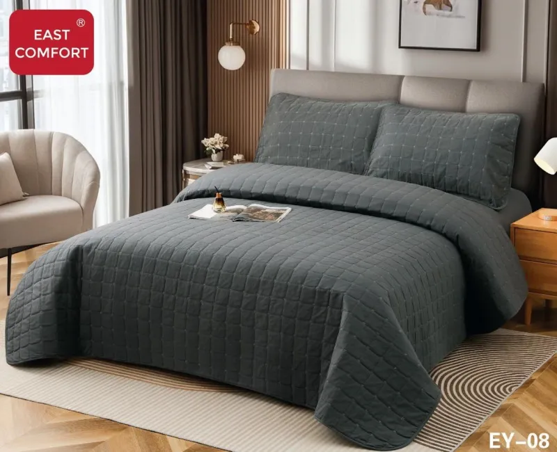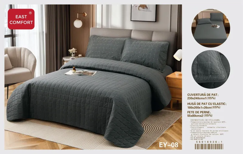EAST COMFORT Cuvertura+Husa de pat cu elastic+2 Fete de perna,Gri inchis-EY08