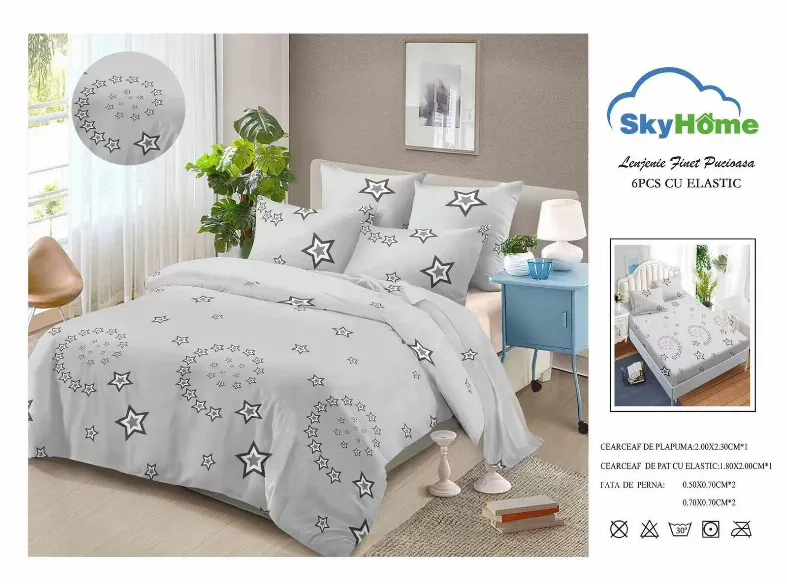 Lenjerii de pat Finet 6 piese cu Elastic, gri cu stele albe si gri-SKE21