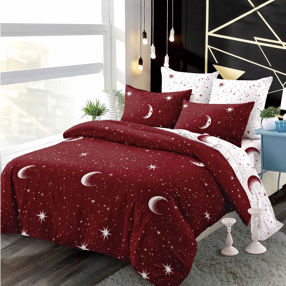 PRIMAVARA Lenjerii de pat Finet 6 piese cu Elastic, roșu cu lună și stele-FEL265