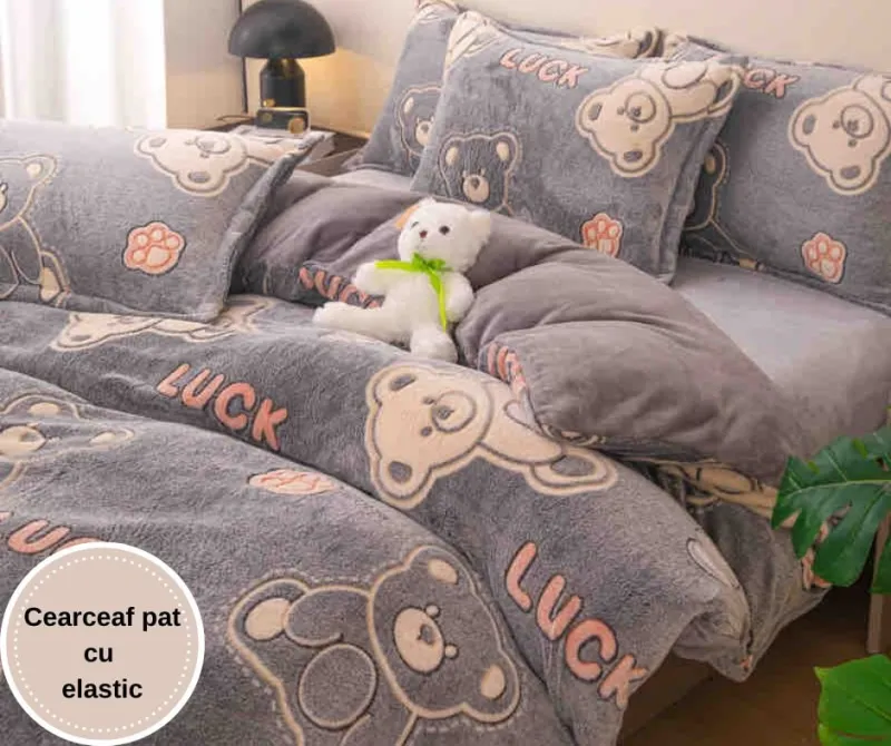 Material: microfibră plușată, groasă și foarte densă (are textura catifelată și este foarte placută la atingere)