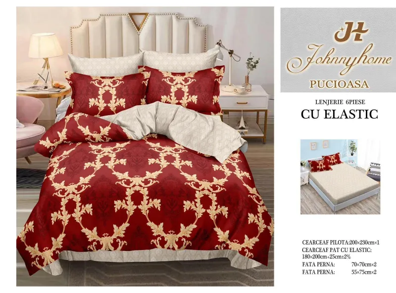 Lenjerii de pat Finet 6 piese cu Elastic-T218, descoperă confortul și rafinamentul oferite de setul de lenjerie de pat tip finet, format din 6 piese, într-o nuanță elegantă. Această colecție excepțională este realizată dintr-un bumbac tratat special, conferind tesaturii sale o senzație moale și durabilitate remarcabilă în timp. Este alegerea perfectă pentru a-ți menține patul mereu proaspăt și impecabil.