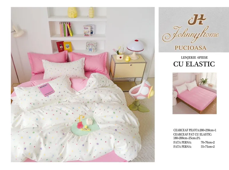 Lenjerii de pat Finet 6 piese cu Elastic-T246, descoperă confortul și rafinamentul oferite de setul de lenjerie de pat tip finet, format din 6 piese, într-o nuanță elegantă. Această colecție excepțională este realizată dintr-un bumbac tratat special, conferind tesaturii sale o senzație moale și durabilitate remarcabilă în timp. Este alegerea perfectă pentru a-ți menține patul mereu proaspăt și impecabil.