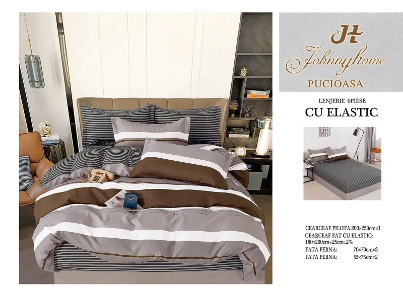 Lenjerii de pat Finet 6 piese cu Elastic-FEL61 descoperă confortul și rafinamentul oferite de setul de lenjerie de pat tip finet, format din 6 piese, într-o nuanță elegantă. Această colecție excepțională este realizată dintr-un bumbac tratat special, conferind tesaturii sale o senzație moale și durabilitate remarcabilă în timp. Este alegerea perfectă pentru a-ți menține patul mereu proaspăt și impecabil.