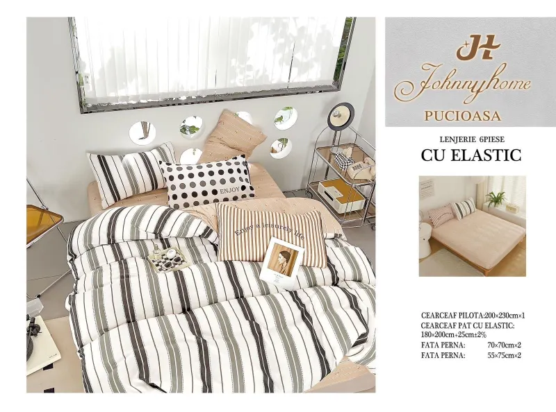Lenjerii de pat Finet 6 piese cu Elastic-T266 descoperă confortul și rafinamentul oferite de setul de lenjerie de pat tip finet, format din 6 piese, într-o nuanță elegantă. Această colecție excepțională este realizată dintr-un bumbac tratat special, conferind tesaturii sale o senzație moale și durabilitate remarcabilă în timp. Este alegerea perfectă pentru a-ți menține patul mereu proaspăt și impecabil.