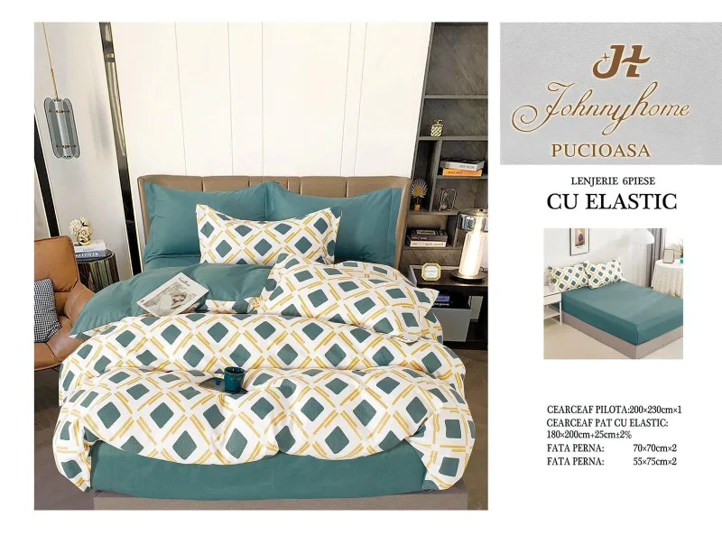 Lenjerii de pat Finet 6 piese cu Elastic-T269 descoperă confortul și rafinamentul oferite de setul de lenjerie de pat tip finet, format din 6 piese, într-o nuanță elegantă. Această colecție excepțională este realizată dintr-un bumbac tratat special, conferind tesaturii sale o senzație moale și durabilitate remarcabilă în timp. Este alegerea perfectă pentru a-ți menține patul mereu proaspăt și impecabil.