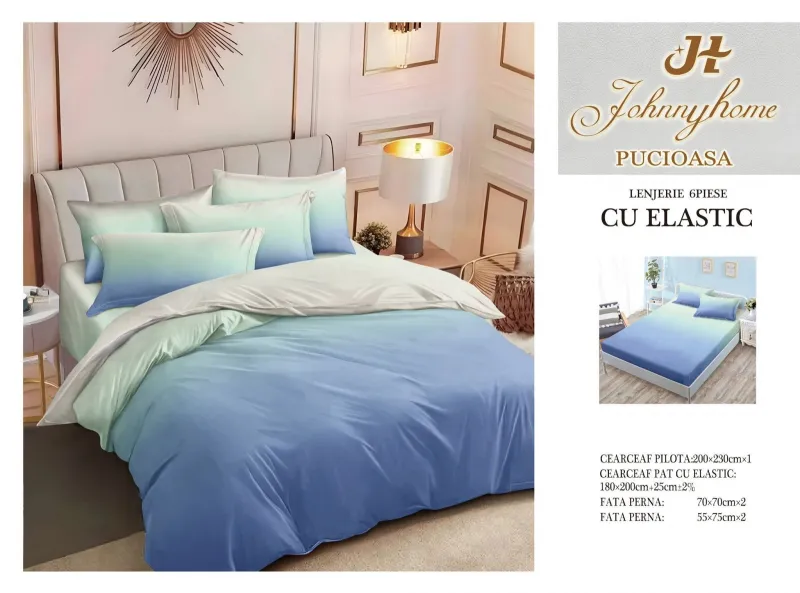 Lenjerii de pat Finet 6 piese cu Elastic-T283, descoperă confortul și rafinamentul oferite de setul de lenjerie de pat tip finet, format din 6 piese, într-o nuanță elegantă. Această colecție excepțională este realizată dintr-un bumbac tratat special, conferind tesaturii sale o senzație moale și durabilitate remarcabilă în timp. Este alegerea perfectă pentru a-ți menține patul mereu proaspăt și impecabil.