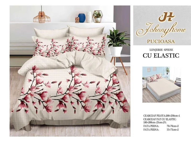 Lenjerii de pat Finet 6 piese cu Elastic-T290 descoperă confortul și rafinamentul oferite de setul de lenjerie de pat tip finet, format din 6 piese, într-o nuanță elegantă. Această colecție excepțională este realizată dintr-un bumbac tratat special, conferind tesaturii sale o senzație moale și durabilitate remarcabilă în timp. Este alegerea perfectă pentru a-ți menține patul mereu proaspăt și impecabil.