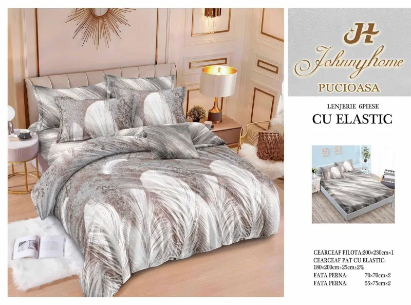 Lenjerii de pat Finet 6 piese cu Elastic-T299, descoperă confortul și rafinamentul oferite de setul de lenjerie de pat tip finet, format din 6 piese, într-o nuanță elegantă. Această colecție excepțională este realizată dintr-un bumbac tratat special, conferind tesaturii sale o senzație moale și durabilitate remarcabilă în timp. Este alegerea perfectă pentru a-ți menține patul mereu proaspăt și impecabil.