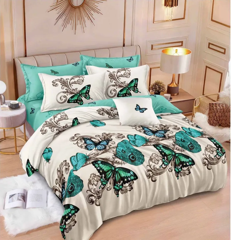 PUCIOASA Lenjerie de pat Finet Pucioasa 6 piese,Alb cu Fluturi turcoaz-R587