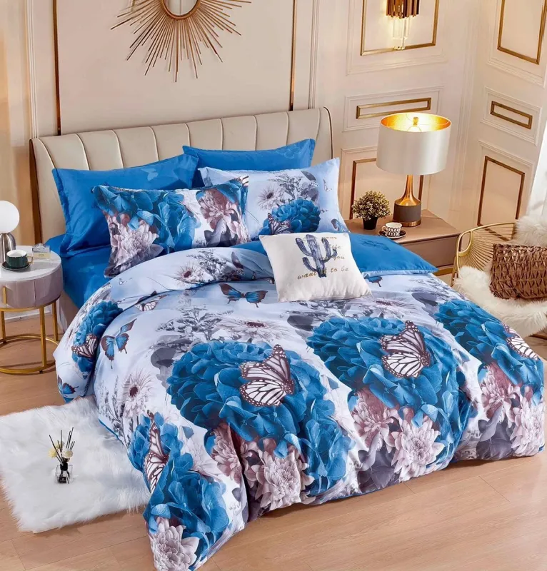Ce frumos e cum sta pe pat! Mi-am luat-o mai mult ca sa infrumusetez dormitorul si chiar asa a iesit. Albastrul cu florile alea si fluturii parca mi-au adus primavara in casa. Si materialul, finetul asta, e asa moale, nici nu stii cum adormi. Parca m-am culcat in nori. Foarte multumita!