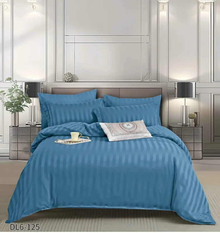 Lenjerie de pat dublu din damasc finetat, linear (tesatura din fabrica, nu imprimata, cu dunga de 1 cm grosime), confectionata din bumbac 70% + 30% poliester, cu 6 piese, folosita cel mai mult in regimul hotelier, datorita simplitatii si calitatii extraordinare. Materialul are un aspect usor lucios pentru o nota de eleganta si rafinament, datorita tesaturii speciale. Damascul este recunoscut pentru rezistenta sa in timp la nenumarate spalari, nemodificandu-si aspectul.