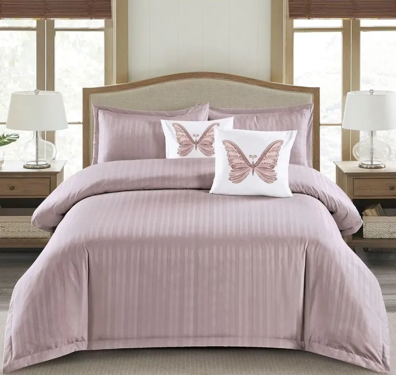 Lenjerie de pat dublu din damasc finetat, linear (tesatura din fabrica, ci nu imprimata, cu dunga de 1 cm grosime), confectionata din bumbac 70% + 30% poliester, cu 6 piese, folosita cel mai mult in regimul hotelier, datorita simplitatii si calitatii extraordinare. Materialul are un aspect usor lucios pentru o nota de eleganta si rafinament, datorita tesaturii speciale. Damascul este recunoscut pentru rezistenta sa in timp la nenumarate spalari, nemodificandu-si aspectul.