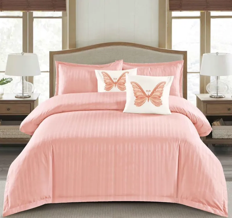 Lenjerie de pat dublu din damasc finetat, linear (tesatura din fabrica, ci nu imprimata, cu dunga de 1 cm grosime), confectionata din bumbac 70% + 30% poliester, cu 6 piese, folosita cel mai mult in regimul hotelier, datorita simplitatii si calitatii extraordinare. Materialul are un aspect usor lucios pentru o nota de eleganta si rafinament, datorita tesaturii speciale. Damascul este recunoscut pentru rezistenta sa in timp la nenumarate spalari, nemodificandu-si aspectul.