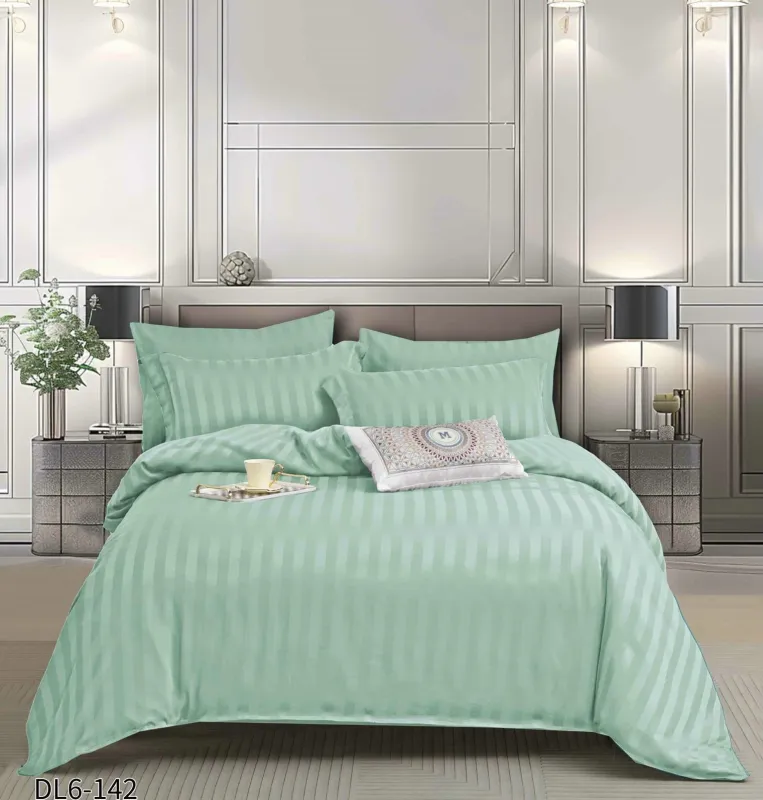Lenjerie de pat dublu din damasc finetat, linear (tesatura din fabrica, nu imprimata, cu dunga de 1 cm grosime), confectionata din bumbac 70% + 30% poliester, cu 6 piese, folosita cel mai mult in regimul hotelier, datorita simplitatii si calitatii extraordinare. Materialul are un aspect usor lucios pentru o nota de eleganta si rafinament, datorita tesaturii speciale. Damascul este recunoscut pentru rezistenta sa in timp la nenumarate spalari, nemodificandu-si aspectul.