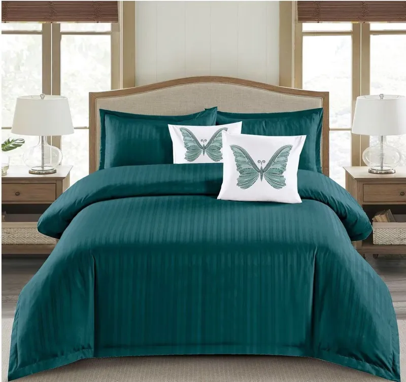 Lenjerie de pat dublu din damasc finetat, linear (tesatura din fabrica, ci nu imprimata, cu dunga de 1 cm grosime), confectionata din bumbac 70% + 30% poliester, cu 6 piese, folosita cel mai mult in regimul hotelier, datorita simplitatii si calitatii extraordinare. Materialul are un aspect usor lucios pentru o nota de eleganta si rafinament, datorita tesaturii speciale. Damascul este recunoscut pentru rezistenta sa in timp la nenumarate spalari, nemodificandu-si aspectul.