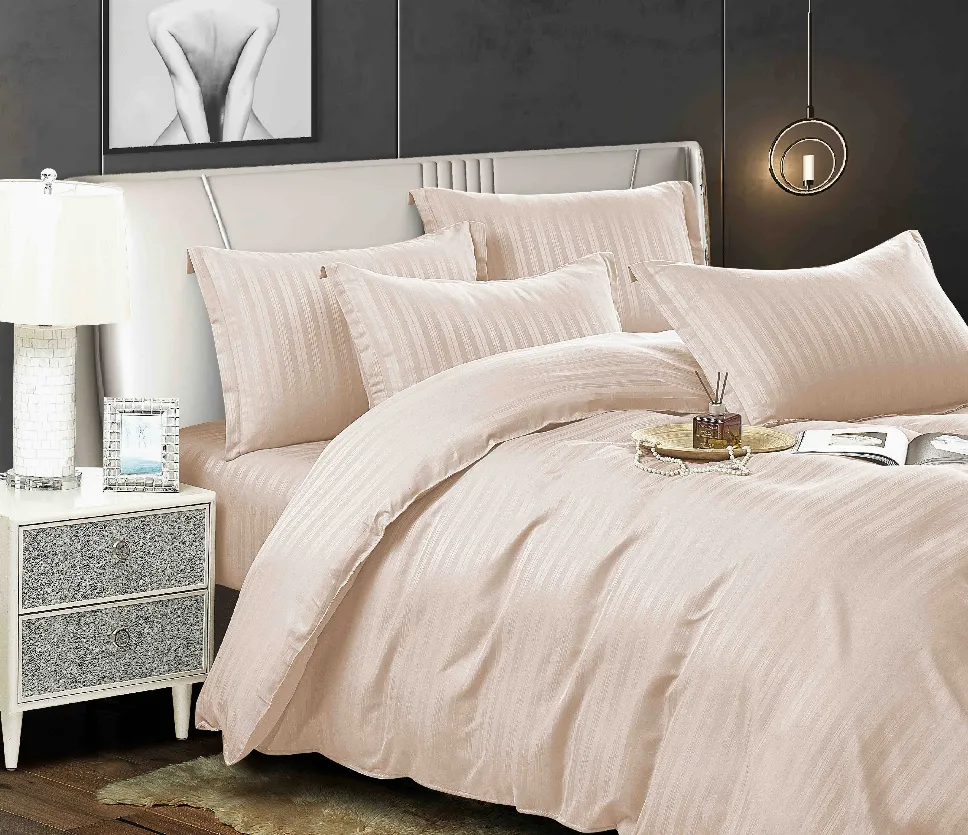 Lenjerie de pat Damasc, Pat 2 Persoane, 6 Piese, bej cu model subtil-DM21- Aduceți rafinamentul hotelurilor direct în dormitorul dumneavoastră. Această lenjerie de calitate superioară este creată dintr-o țesătură premium de tip damasc, renumită pentru modelul său elegant, țesut direct în material, și pentru un luciu discret, de inspirație satinată.