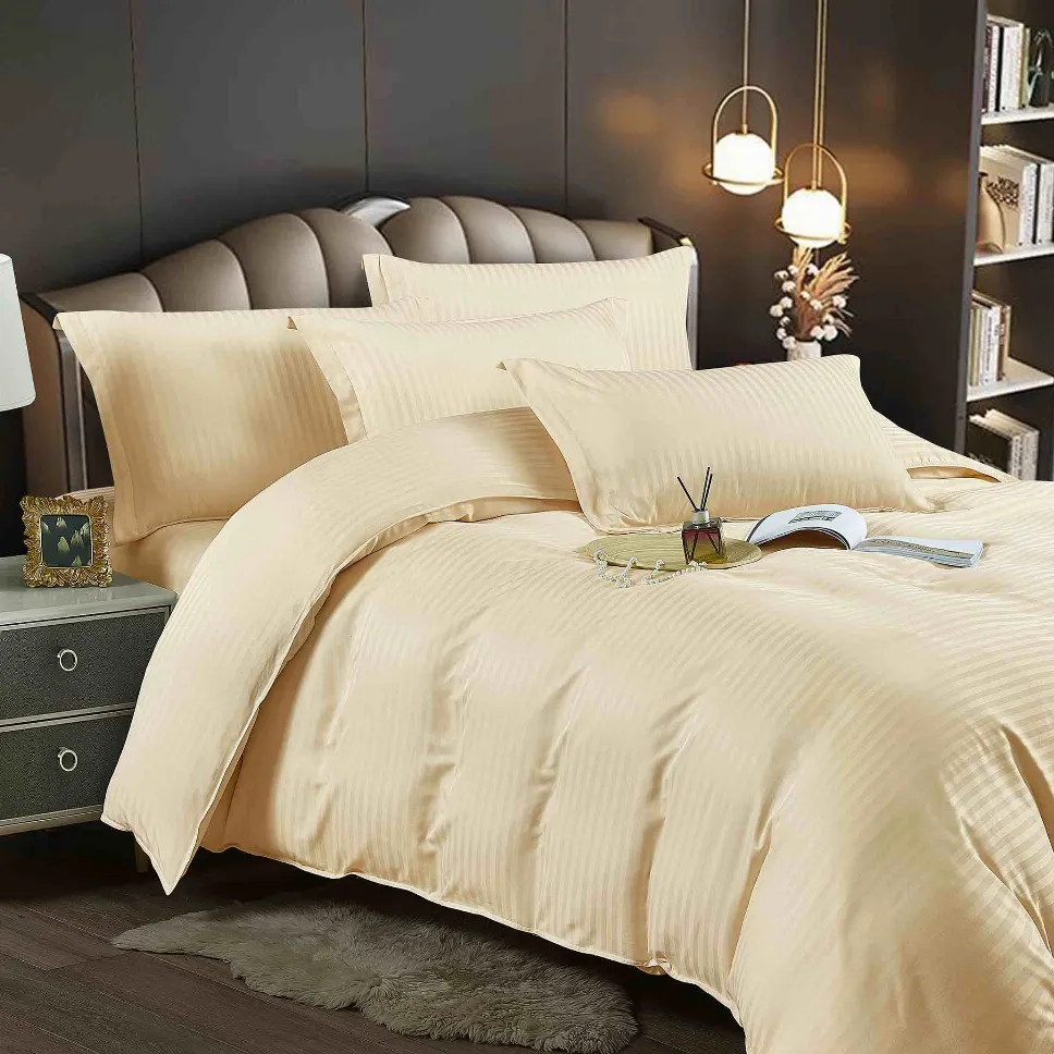 Lenjerie de pat Damasc, Pat 2 Persoane, 6 Piese, crem cu dungi fine-DM19- Aduceți rafinamentul hotelurilor direct în dormitorul dumneavoastră. Această lenjerie de calitate superioară este creată dintr-o țesătură premium de tip damasc, renumită pentru modelul său elegant, țesut direct în material, și pentru un luciu discret, de inspirație satinată.