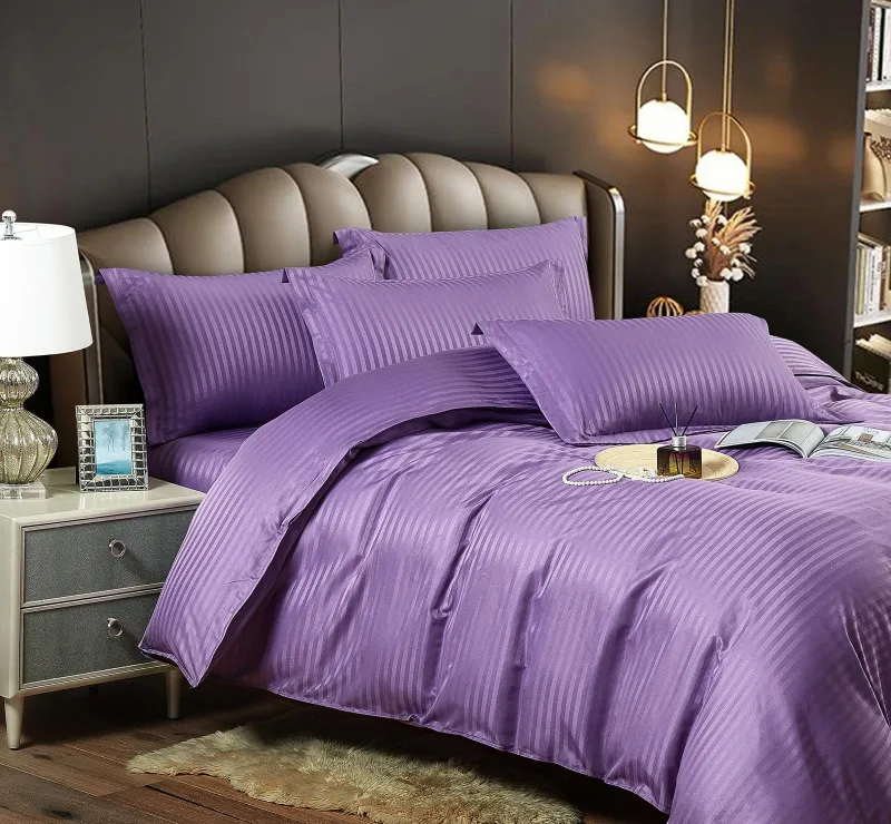 Lenjerie de pat dublu din damasc finetat, linear (tesatura din fabrica, ci nu imprimata, cu dunga de 1 cm grosime), confectionata din bumbac 70% + 30% poliester, cu 6 piese, folosita cel mai mult in regimul hotelier, datorita simplitatii si calitatii extraordinare. Materialul are un aspect usor lucios pentru o nota de eleganta si rafinament, datorita tesaturii speciale. Damascul este recunoscut pentru rezistenta sa in timp la nenumarate spalari, nemodificandu-si aspectul.