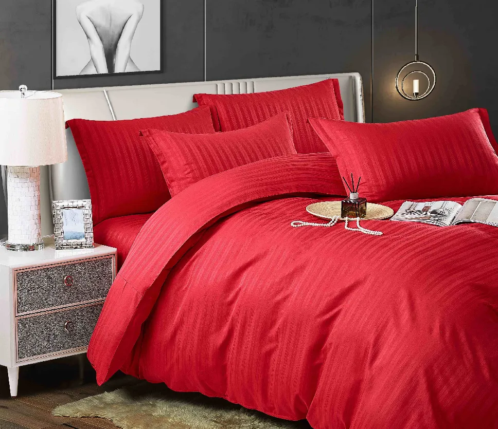 Lenjerie de pat Damasc, Pat 2 Persoane, 6 Piese, roșu cu dungi fine-DM20- Aduceți rafinamentul hotelurilor direct în dormitorul dumneavoastră. Această lenjerie de calitate superioară este creată dintr-o țesătură premium de tip damasc, renumită pentru modelul său elegant, țesut direct în material, și pentru un luciu discret, de inspirație satinată.