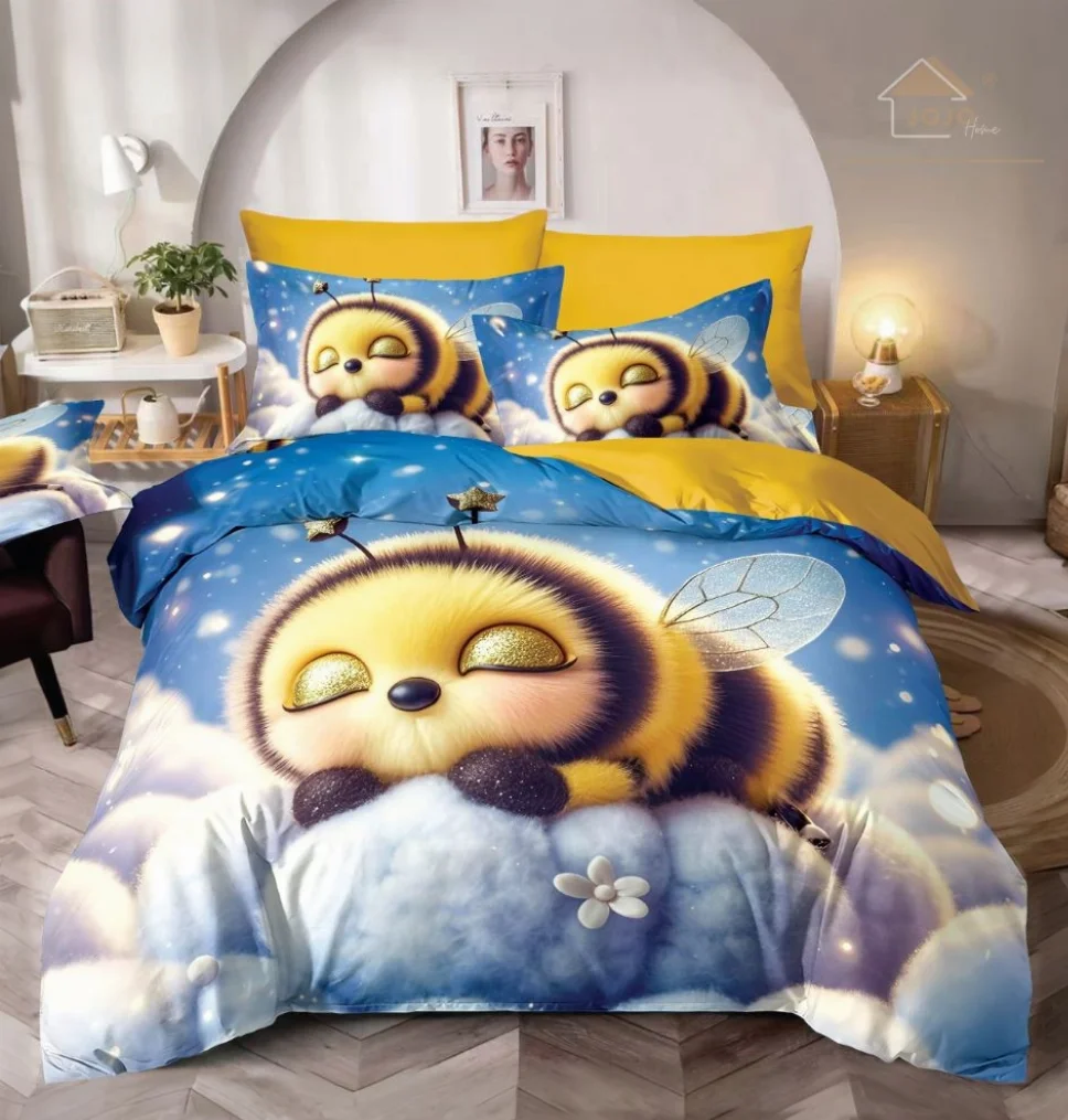 JOJO HOME Lenjerie de pat din finet, albastru cu albine pufoase galbene-LD2