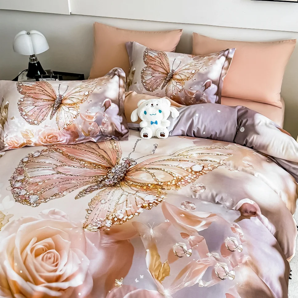 JOJO HOME Lenjerie de pat din finet, bej cu fluturi și trandafiri-LD42
