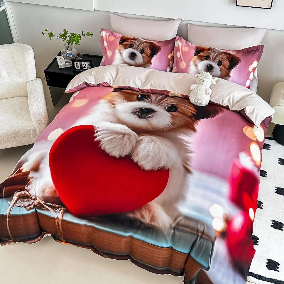 JOJO HOME Lenjerie de pat din finet, cu cățeluș și inimă roșie-LD43