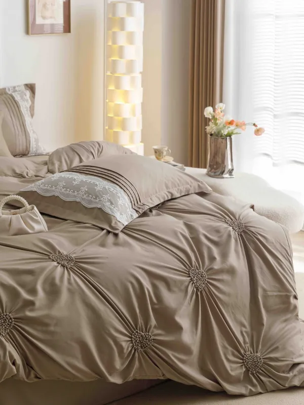 JOJO HOME Lenjerie de pat din finet, cu pliuri si inimioare brodate,Bej inchis-BR10
