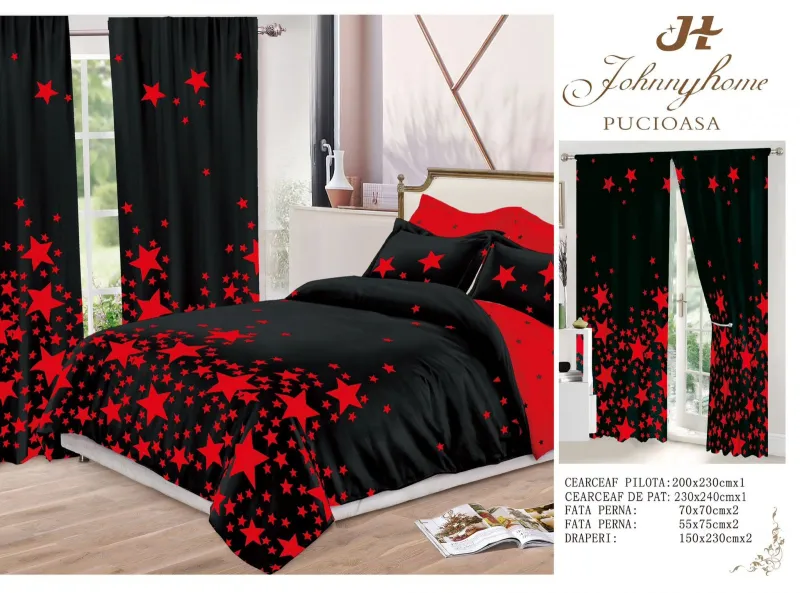 PUCIOASA Lenjerie de pat Finet, 6 piese+ 2 Draperii CADOU,Negru cu stelute rosii-FD16