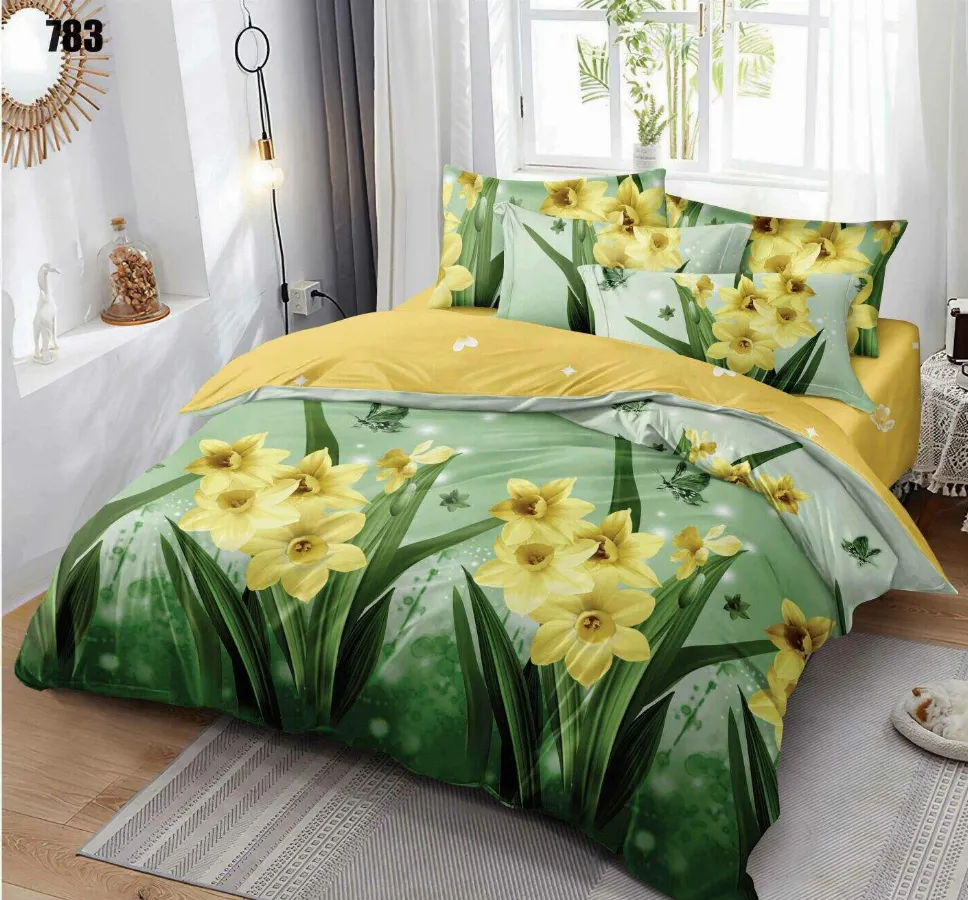 SUPER ELEGANT PUCIOASA Lenjerie de pat Finet 6 piese, galbene cu narcise și frunze verzi-LP783