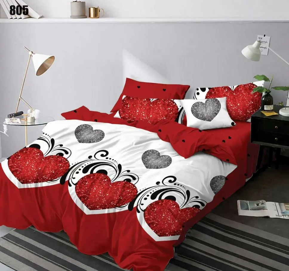 Lenjerie de pat Finet 6 piese, inimioare roșii cu accente argintii-LP805 - Descoperă confortul și rafinamentul oferite de acest set de lenjerie de pat din finet, format din 6 piese. Colecția este realizată dintr-un material textil tratat special, conferind țesăturii o senzație moale la atingere și o durabilitate remarcabilă în timp.