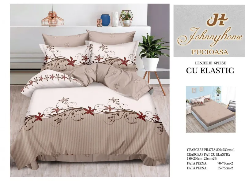 Lenjerii de pat Finet 6 piese cu Elastic-T144, descoperă confortul și rafinamentul oferite de setul de lenjerie de pat tip finet, format din 6 piese, într-o nuanță elegantă. Această colecție excepțională este realizată dintr-un bumbac tratat special, conferind tesaturii sale o senzație moale și durabilitate remarcabilă în timp. Este alegerea perfectă pentru a-ți menține patul mereu proaspăt și impecabil.