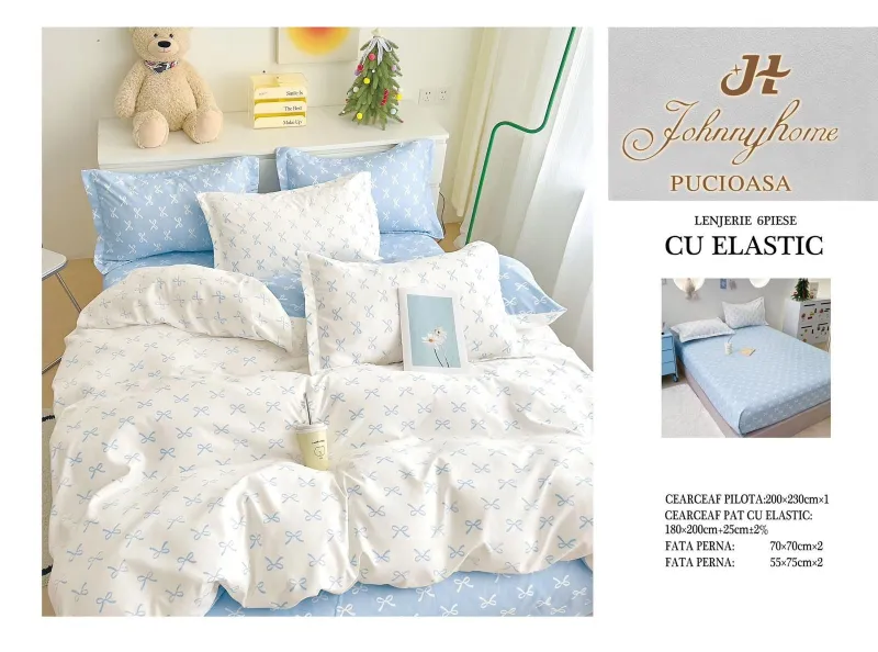 Lenjerii de pat Finet 6 piese cu Elastic- ,descoperă confortul și rafinamentul oferite de setul de lenjerie de pat tip finet, format din 6 piese, într-o nuanță elegantă. Această colecție excepțională este realizată dintr-un bumbac tratat special, conferind tesaturii sale o senzație moale și durabilitate remarcabilă în timp. Este alegerea perfectă pentru a-ți menține patul mereu proaspăt și impecabil.