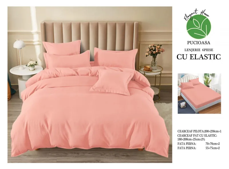 Lenjerii de pat Finet 6 piese cu Elastic,Uni,Roz-UT10, descoperă confortul și rafinamentul oferite de setul de lenjerie de pat tip finet, format din 6 piese, într-o nuanță elegantă. Această colecție excepțională este realizată dintr-un bumbac tratat special, conferind tesaturii sale o senzație moale și durabilitate remarcabilă în timp. Este alegerea perfectă pentru a-ți menține patul mereu proaspăt și impecabil.