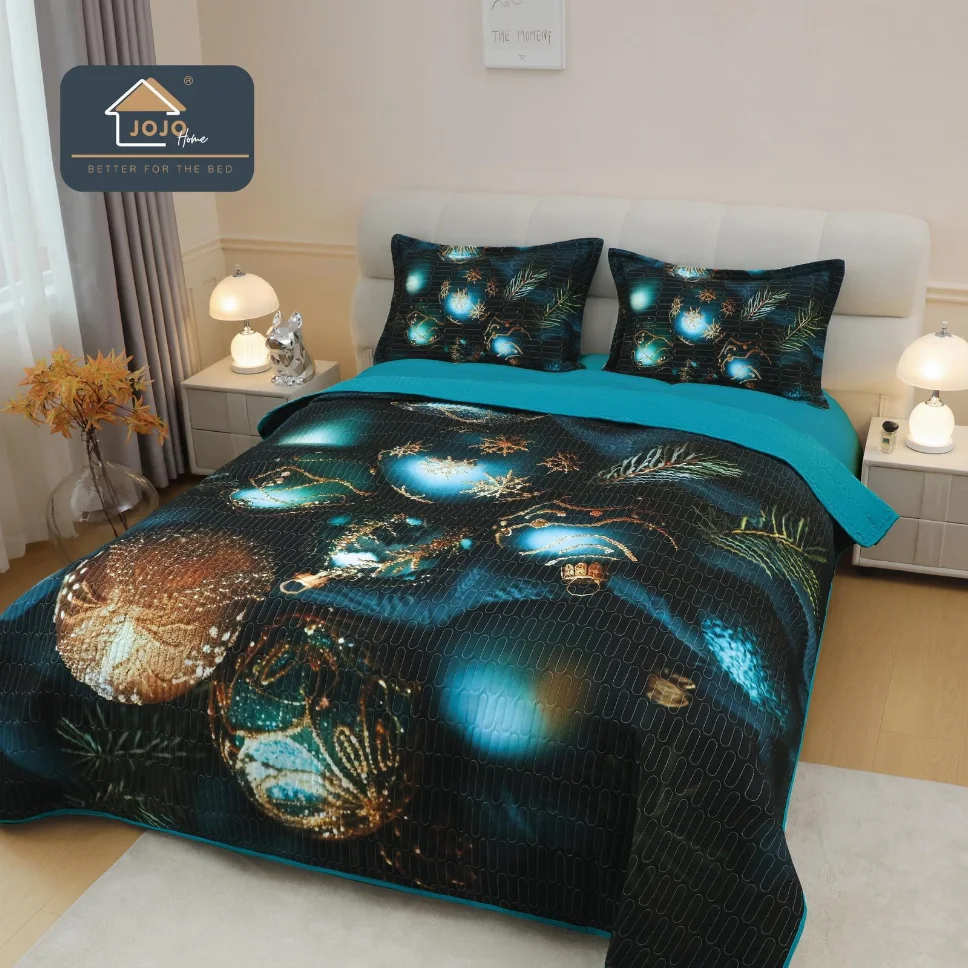 Descoperă magia sărbătorilor de iarnă chiar în dormitorul tău! O Cuvertura matlasata 3 piese, neagră cu globuri luminoase aurii-CVM9 nu este doar un element de decor, ci și o modalitate excelentă de a-ți proteja lenjeria de praf și de a adăuga un plus de căldură și confort. Cu un design vesel, specific Crăciunului, transformă instantaneu camera într-un spațiu festiv și primitor. Materialul de calitate asigură rezistență în timp, iar culorile vibrante ale imprimeului se vor menține frumoase spălare după spălare.