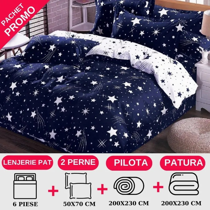 Lenjerie pentru pat dublu cu 6 piese, confectionata din 100% bumbac, tesatura tip finet.